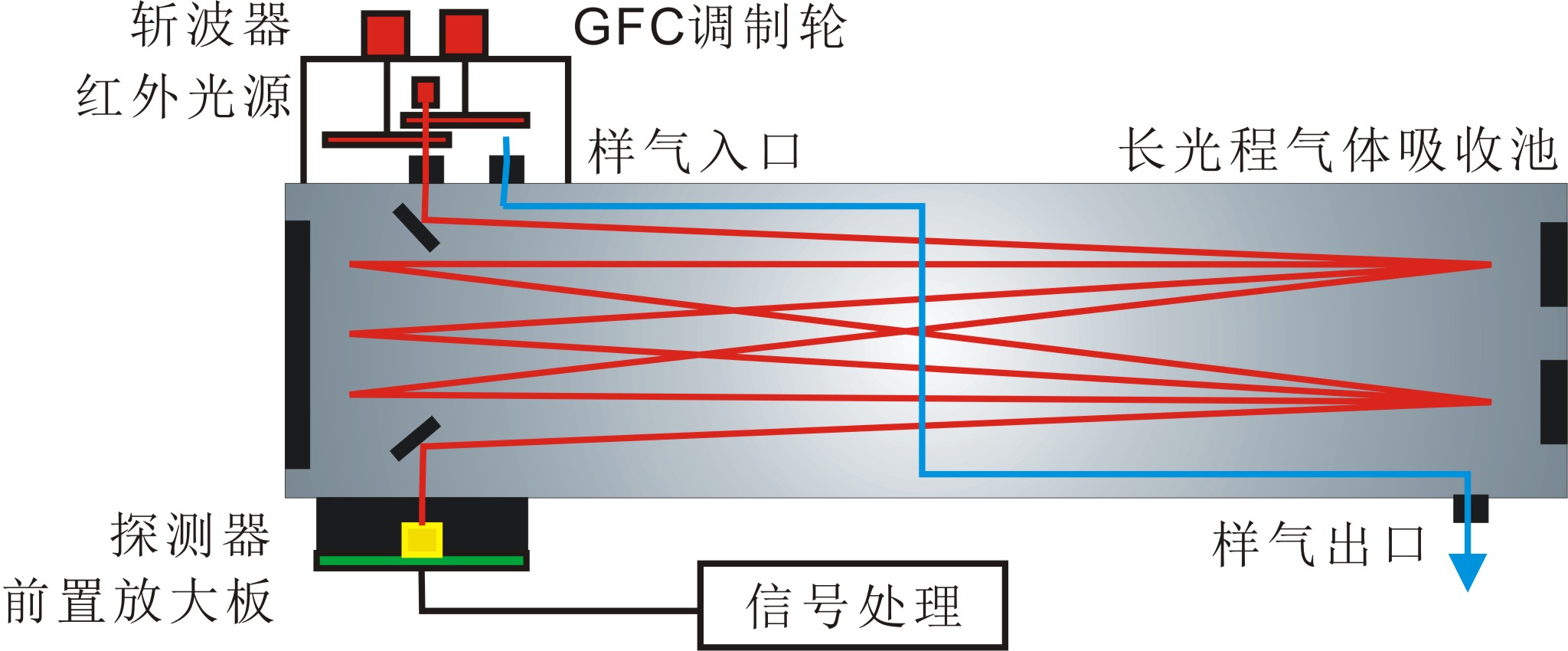當紅外光通過待測氣體池時,這些氣體分子對特定波長的紅外光有吸收作用,并且其吸收關系服從朗伯比爾吸收定律。光源發出的紅外光經GFC調制輪交替進入氣體池,一路被充滿待測氣體的氣泡所吸收,一路穿過完全不含待測氣體的氣泡兩路光分別經透鏡匯聚后由紅外探測器接收,經過信號處理得到測量信號和參考信號。通過對兩路信號進行分析,可以得出氣體中相關組分的濃度。